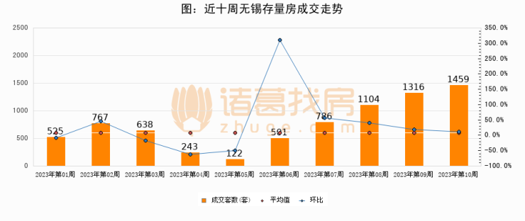 存量房方面,第10周无锡存量房成交1459套,较上周增加143套,环比上涨10.9%。从近十周成交走势来看,周均成交套数为746套,本周高于平均水平95.6%。