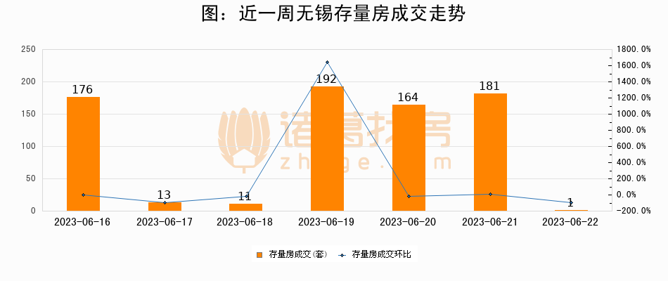 从存量房来看,2023年06月22日无锡存量房单日成交1套,比昨日减少180套,环比下降99.5%。从近一周存量房成交来看,无锡存量房日均成交套数为105套,06月22日单日成交1套,低于近一周平均水平99%。