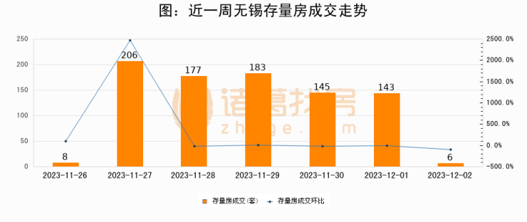 从存量房来看,2023年12月02日无锡存量房单日成交6套,比昨日减少137套,环比下降95.8%。从近一周存量房成交来看,无锡存量房日均成交套数为124套,12月02日单日成交6套,低于近一周平均水平95.2%。