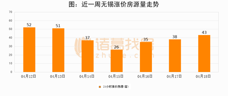 根据诸葛找房数据显示,无锡24小时涨价房源量为43套,较04月17日增加5套,环比上涨13.2%。与此同时,涨价房源占比小幅扩大,业主信心有所提升。