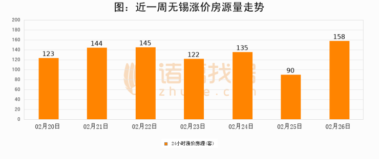 根据诸葛找房数据显示,无锡24小时涨价房源量为158套,较02月25日增加68套,环比上涨75.6%。与此同时,涨价房源占比小幅扩大,业主信心有所提升。
