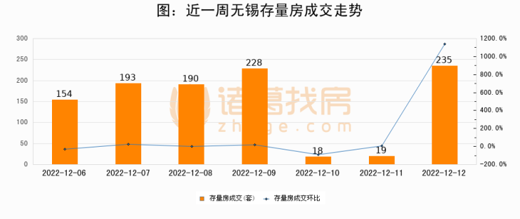 从存量房来看,2022年12月12日无锡存量房单日成交235套,比昨日增加216套,环比上涨1136.8%。从近一周存量房成交来看,无锡存量房日均成交套数为148套,其中12月12日成交量最高为235套,12月12日单日成交235套,高于近一周平均水平58.8%。