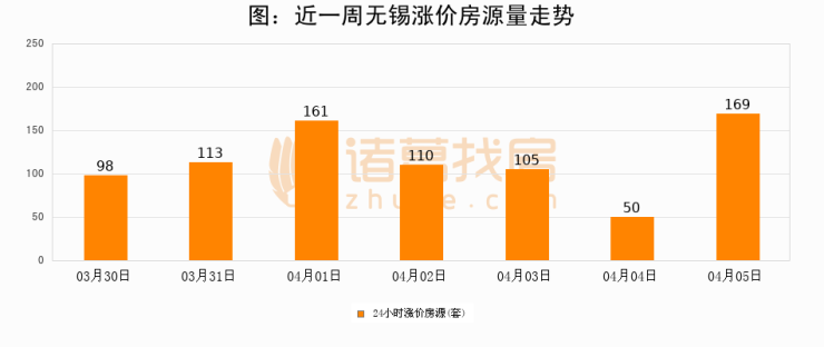 根据诸葛找房数据显示,无锡24小时涨价房源量为169套,较04月04日增加119套,环比上涨238%。与此同时,涨价房源占比小幅扩大,业主信心有所提升。