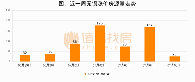根据诸葛找房数据显示,无锡24小时涨价房源量为25套,较07月04日减少142套,环比下降85%。与此同时,涨价房源占比小幅回落,对于购房者来说是一个入市窗口期,购房者可抓住时机入市。
