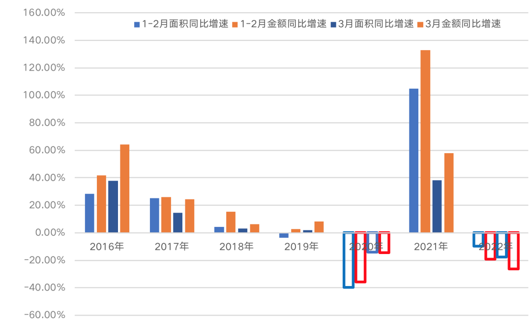 进入3月,虽然多项指标增速仍为负值,但随着2月下旬各地陆续复工,3月整体楼市也开始逐步回暖,较2022年1-2月销售面积和销售金额同比增速有所收窄。