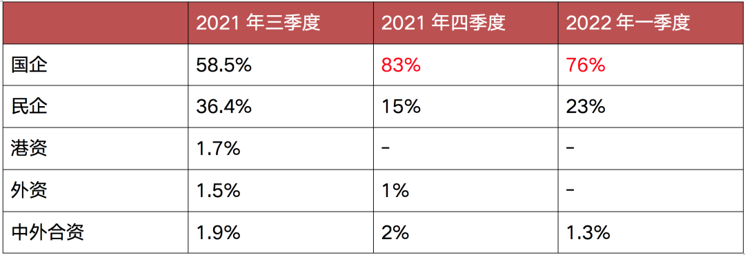 2022年一季度,国资房企仍为境内外发债主力,债券融资占比76%,较去年四季度略有下降,民营房企发债融资占比略有上升,由2021年四季度的15%升至23%。