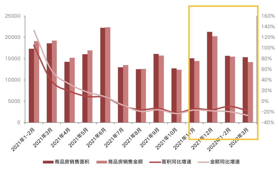国家统计局数据显示2022年1-3月,商品房销售面积31046万平方米,同比下降13.8%;商品房销售额29655亿元,下降22.7%;二者降幅较1-2月扩大4.2pcts和3.5pcts。