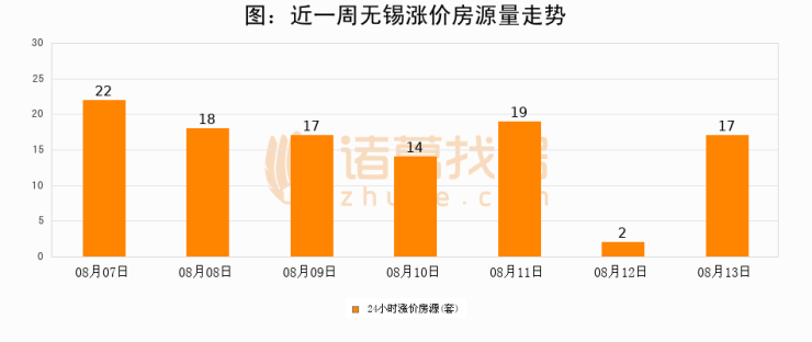 根据诸葛找房数据显示,无锡24小时涨价房源量为17套,较08月12日增加15套,环比上涨750%。与此同时,涨价房源占比小幅扩大,业主信心有所提升。