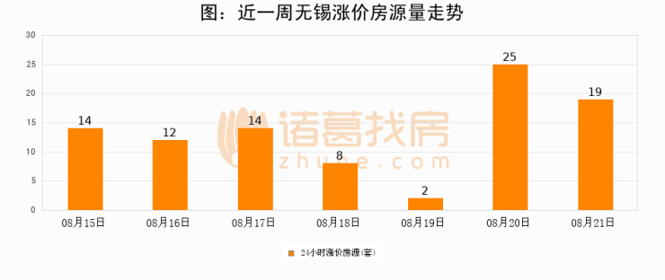 根据诸葛找房数据显示,无锡24小时涨价房源量为19套,较08月20日减少6套,环比下降24%。与此同时,涨价房源占比小幅回落,对于购房者来说是一个入市窗口期,购房者可抓住时机入市。
