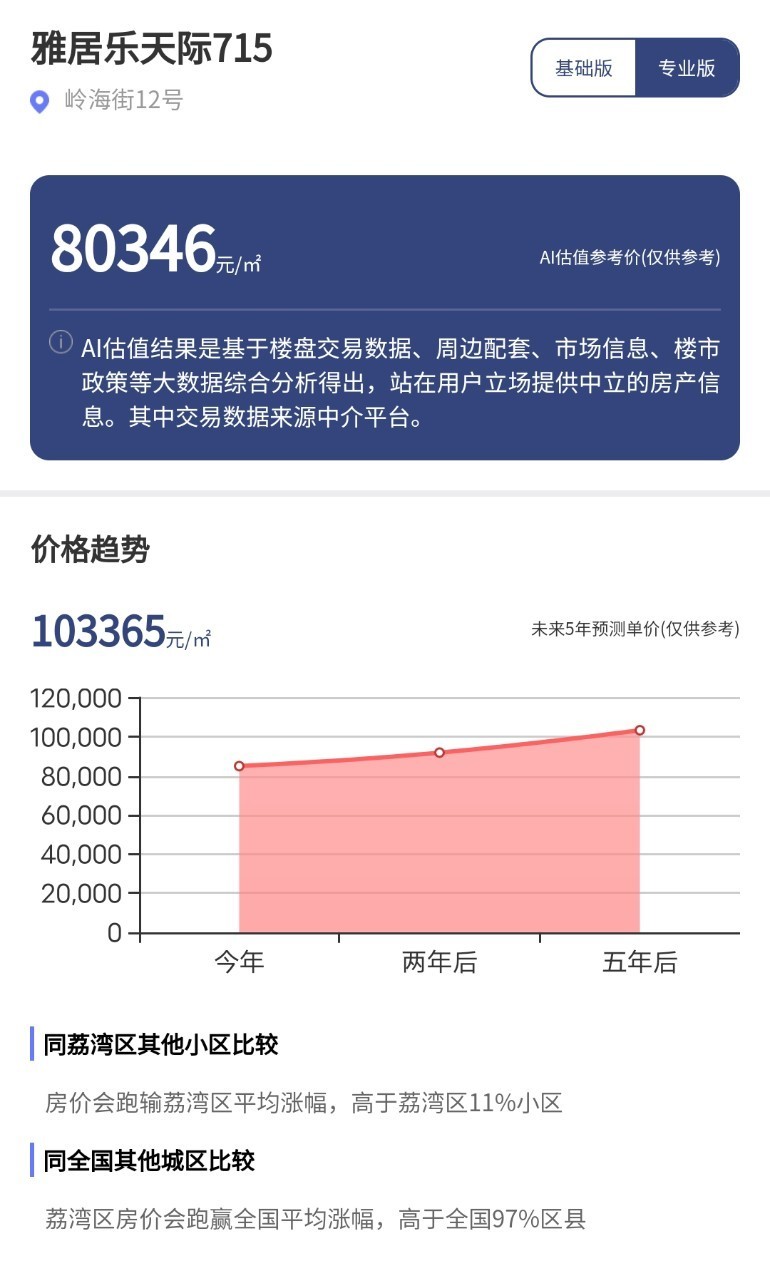 根据每经AI品房小程序大数据测算,该小区房价未来5年将达到103365元/平方米,尽管跑输荔湾区平均涨幅,在荔湾区大约排名89%位置。但和当前“工抵房”的购入价格相比,一套房子将有286万元的浮动空间。