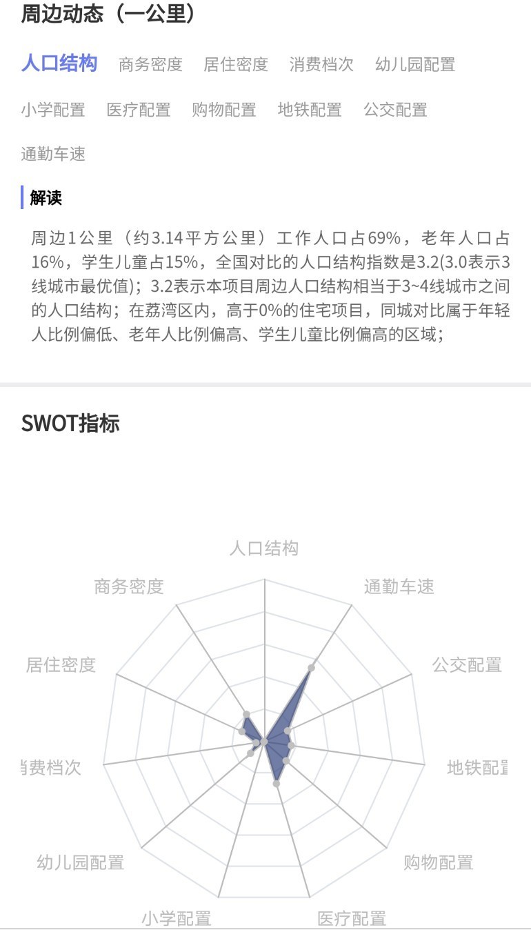 与徐州吾悦华府截然不同的是,荔湾雅居乐天际周边消费客单价46元,相当于二三线城市,在荔湾区内属于低消费档次;同时但周边大小购物商城多达15个,人口结构指数达到3.2(3代表着三线城市的最优值),这意味着雅居乐天际715在人口结构方面相当于三四线城市的人口结构。