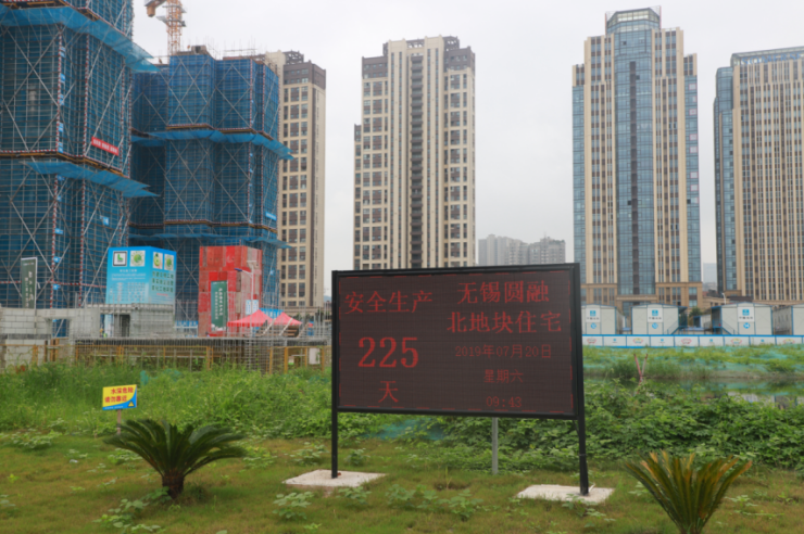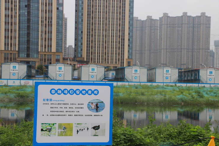 一入工地,一列整整齐齐的墨绿旗帜在风中唱响迎宾之歌,旁边则是大片自然水源和浅水草甸,各类常见水生植物在工地中安然盛开,科技化的PM2.5数据显示屏24小时实时监测,整个施工作业环境绿色环保。而这,也正是圆融广场标准化示范工地的魅力所在。