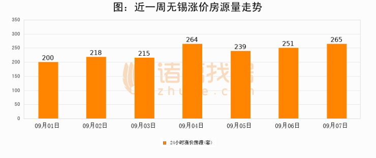 根据诸葛找房数据显示,无锡24小时涨价房源量为265套,较09月06日增加14套,环比上涨5.6%。与此同时,涨价房源占比小幅扩大,业主信心有所提升。