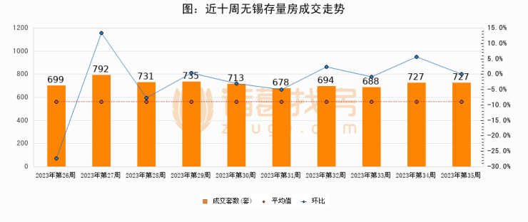 存量房方面,第35周无锡存量房成交727套,较上周持平。从近十周成交走势来看,周均成交套数为718套,本周高于平均水平1.3%。