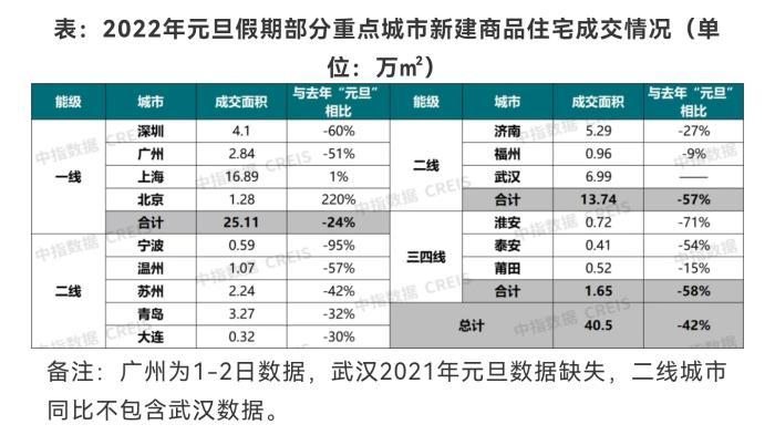具体来看,元旦期间,4个一线城市新建商品住宅累计成交25.11万平方米,较去年同期下降24%。二线代表城市元旦期间新建商品住宅累计成交13.74万平方米,同比下降57%;三四线代表城市累计成交1.65万平方米,同比下降58%。