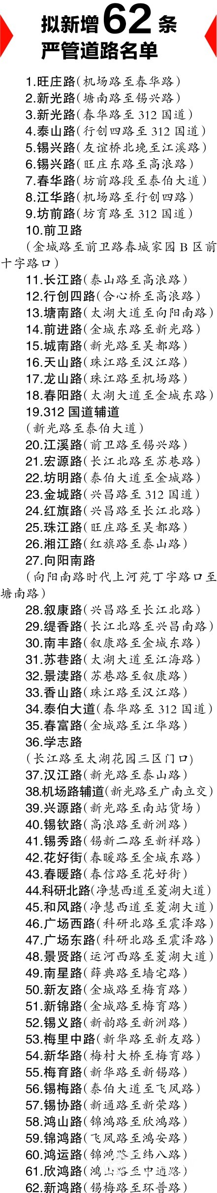为了进一步优化市区交通环境,提高道路通行效率,保障道路交通有序、安全、畅通,无锡交警部门拟对新吴区旺庄路等道路实施严管,违停者将处以100元罚款记3分的处罚。目前,62条严管道路名单正在征求意见,市民可以在无锡交警官方微博相关微博的评论区留言。(晚报记者 蔚来)