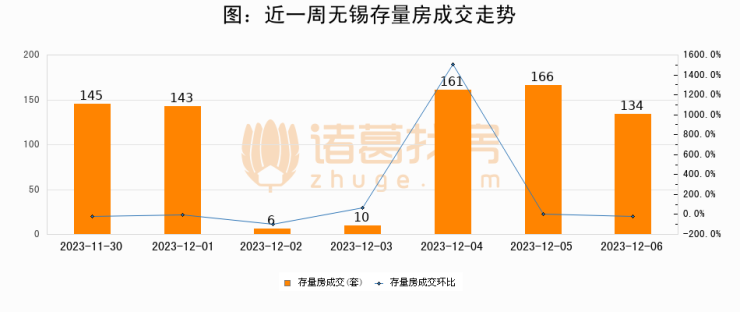 从存量房来看,2023年12月06日无锡存量房单日成交134套,比昨日减少32套,环比下降19.3%。从近一周存量房成交来看,无锡存量房日均成交套数为109套,12月06日单日成交134套,高于近一周平均水平22.9%。