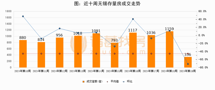 存量房方面,第18周无锡存量房成交336套,较上周减少823套,环比下降71%。从近十周成交走势来看,周均成交套数为920套,本周低于平均水平63.5%。