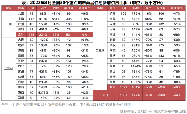 3月整体供应量有了稳步回升,据CRIC监测,30个重点城市预估新增供应面积1307万平方米,环比翻倍增长172%,不过因去年基数较高,3月单月同比回落45%,前3月累计同比下降44%。