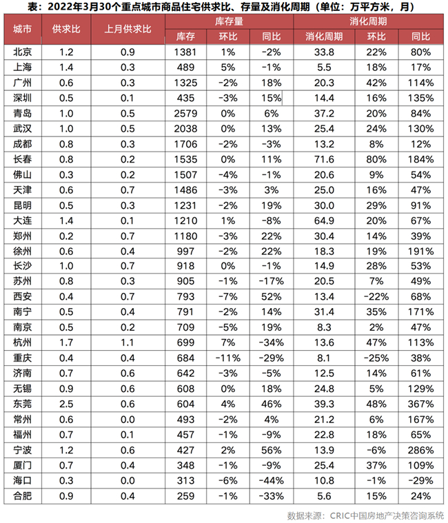 一方面受供应不足制约,另一方面市场信心仍较悲观,叠加部分疫情因素下多城市楼市尚未回暖。因此新房成交规模仍处于历史低位,故3月虽22城商品住宅库存面积持平或下降,但库存消化周期普遍同环比齐升。环比仅海口、宁波、西安和重庆下降。长春、大连、东莞、青岛、郑州、武汉等库存消化周期已超过2年。