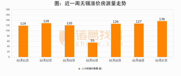 根据诸葛找房数据显示,无锡24小时涨价房源量为136套,较03月06日增加9套,环比上涨7.1%。与此同时,涨价房源占比小幅扩大,业主信心有所提升。