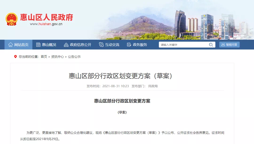 为更广泛、更直接地了解、吸纳公众合理化建议,现将《惠山区部分行政区划变更方案(草案)》予以公布,公开征求社会各界意见。征求时间从即日起至2021年9月29日。