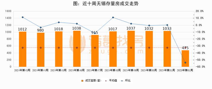 存量房方面,第01周无锡存量房成交475套,较上周减少558套,环比下降54%。从近十周成交走势来看,周均成交套数为955套,本周低于平均水平50.3%。