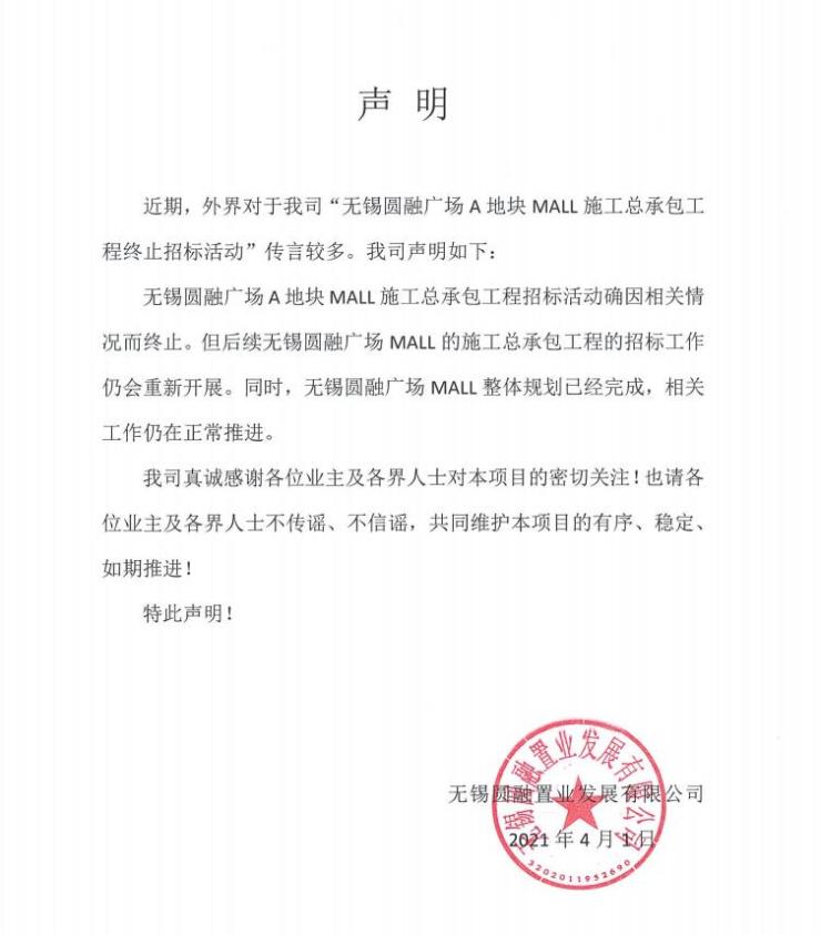 关于无锡圆融广场A地块MALL施工总承包工程招标活动的声明