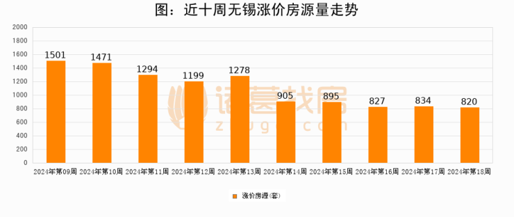 从调价房源来看,第17周无锡涨价房源820套,较上周下降1.7%。与此同时,17周涨价房源占比提升0.1个百分点,业主信心持续恢复。