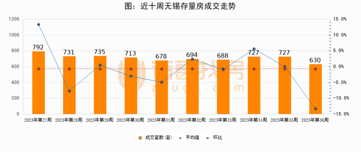 存量房方面,第36周无锡存量房成交630套,较上周减少97套,环比下降13.3%。从近十周成交走势来看,周均成交套数为711套,本周低于平均水平11.4%。