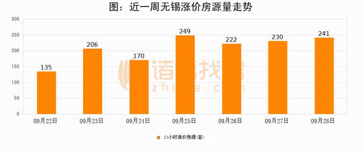 根据诸葛找房数据显示,无锡24小时涨价房源量为241套,较09月27日增加11套,环比上涨4.8%。与此同时,涨价房源占比小幅扩大,业主信心有所提升。