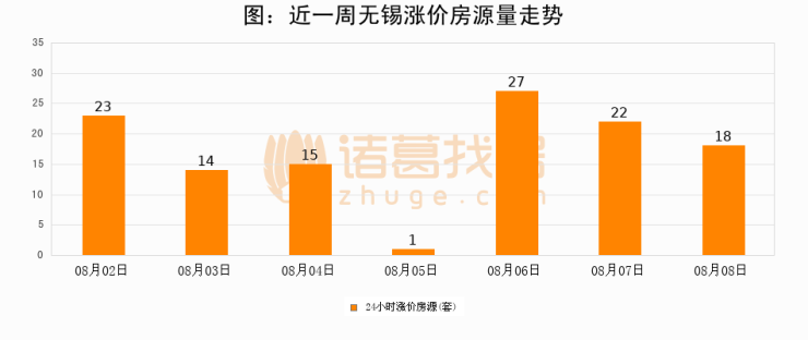 根据诸葛找房数据显示,无锡24小时涨价房源量为18套,较08月07日减少4套,环比下降18.2%。与此同时,涨价房源占比小幅回落,对于购房者来说是一个入市窗口期,购房者可抓住时机入市。