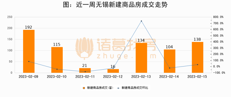 根据无锡市房地产市场管理和监测中心数据显示,2023年02月15日无锡新建商品房成交138套,较昨日增加34套,环比上涨32.7%。近一周无锡新建商品房日均成交103套,其中,02月09日成交量最高为192套。02月15日单日成交138套,高于近一周平均水平34%。