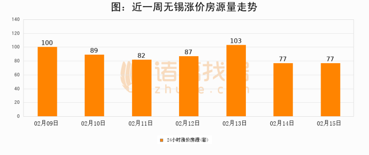 根据诸葛找房数据显示,无锡24小时涨价房源量为77套,较02月14日持平。