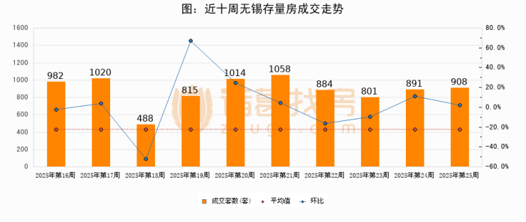 存量房方面,第25周无锡存量房成交908套,较上周增加17套,环比上涨1.9%。从近十周成交走势来看,周均成交套数为886套,本周高于平均水平2.5%。