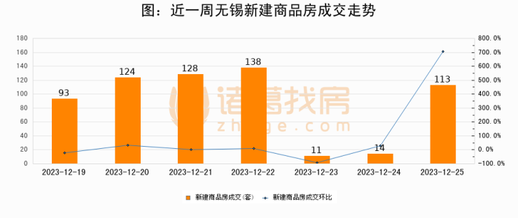 根据无锡市房地产市场管理和监测中心数据显示,2023年12月25日无锡新建商品房成交113套,较昨日增加99套,环比上涨707.1%