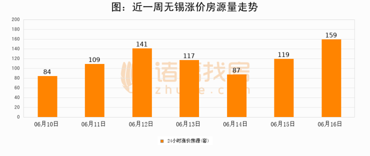根据诸葛找房数据显示,无锡24小时涨价房源量为159套,较06月15日增加40套,环比上涨33.6%。与此同时,涨价房源占比小幅扩大,业主信心有所提升。