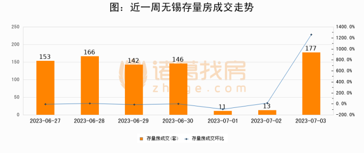 从存量房来看,2023年07月03日无锡存量房单日成交177套,比昨日增加164套,环比上涨1261.5%。从近一周存量房成交来看,无锡存量房日均成交套数为115套,07月03日单日成交177套,高于近一周平均水平53.9%。