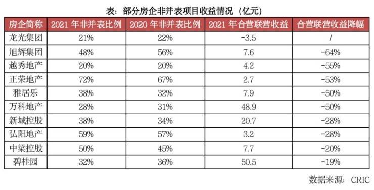 此外,我们通过非并表比例(1-当年营业收入/两年前全口径销售额)估算发现,不少房企在非并表比例基本稳定的情况下,投资收益大不如前。如万科非并表比例保持在30%左右,但是2021年合营联营投资收益下降49.8%,越秀2020、2021两年非并表比例持平,但合营联营投资收益降幅达到55%。