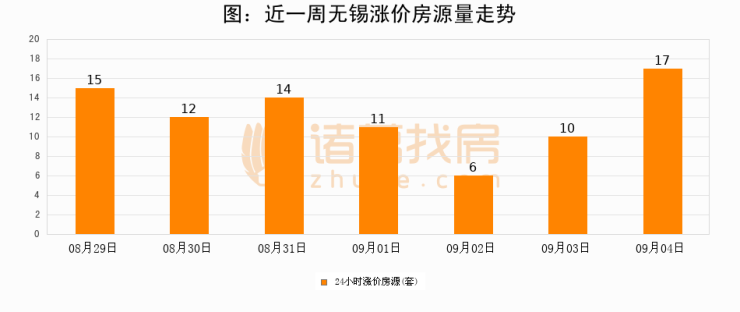 根据诸葛找房数据显示,无锡24小时涨价房源量为17套,较09月03日增加7套,环比上涨70%。与此同时,涨价房源占比小幅扩大,业主信心有所提升。