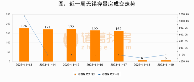 从存量房来看,2023年11月19日无锡存量房单日成交6套,比昨日持平。。从近一周存量房成交来看,无锡存量房日均成交套数为122套,11月19日单日成交6套,低于近一周平均水平95.1%。