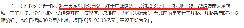 截自:无锡人民政府官网2022.4.2而去年公布的《无锡城市轨道交通第三批建设规划》中,地铁6号线一期起自贡湖湿地公园站,至广源路站,全长约22.3公里,设17座车站(含6座换乘站),建设工期6年。