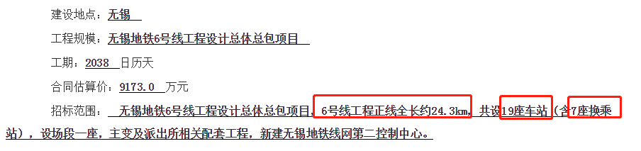地铁6号线传来新消息!新增里程2公里!或增设2站,至东亭!近日,无锡官网发布地铁6号线工程设计总体总包项目,其中提到招标范围为:无锡地铁6号线工程设计总体总包项目,6号线工程正线全长约24.3km,共设19座车站(含7座换乘站 ),建设工期2038日历天。