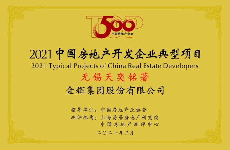 2021年3月16日,由中国房地产协会、上海易居房地产研究院中国房地产测评中心联合主持的“2021中国房地产开发企业500强测评成果”于上海正式发布。金辉集团股份有限公司凭借2020年的表现,获“2021中国房地产开发企业500强”,排名第37名。无锡金辉天奕铭著众望所归荣获“2021中国房地产开发企业典型项目”荣誉。