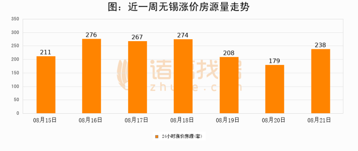 根据诸葛找房数据显示,无锡24小时涨价房源量为238套,较08月20日增加59套,环比上涨33%。与此同时,涨价房源占比小幅扩大,业主信心有所提升。
