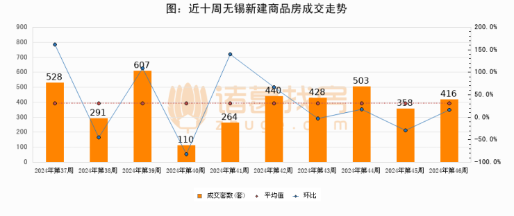 进入2024年第46周(11月11日-11月17日),无锡新建商品房成交416套,较上周增加58套,环比上涨16.2%