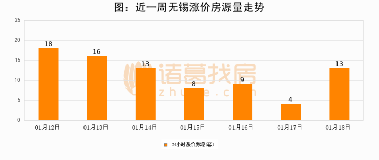 根据诸葛找房数据显示,无锡24小时涨价房源量为13套,较01月17日增加9套,环比上涨225%。与此同时,涨价房源占比小幅扩大,业主信心有所提升。