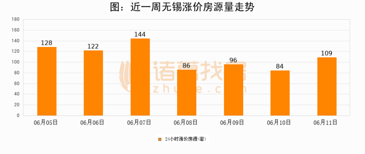 根据诸葛找房数据显示,无锡24小时涨价房源量为109套,较06月10日增加25套,环比上涨29.8%。与此同时,涨价房源占比小幅扩大,业主信心有所提升。
