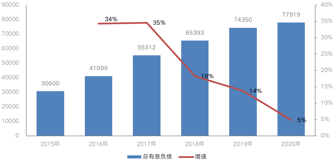 图:历年99家房企总有息负债规模及增速情况(亿元)