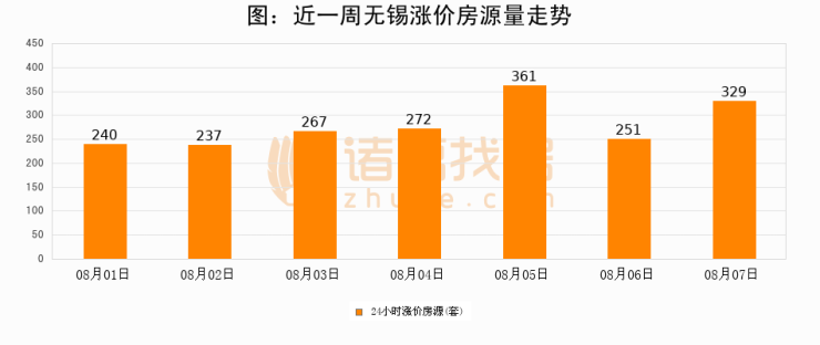 根据诸葛找房数据显示,无锡24小时涨价房源量为329套,较08月06日增加78套,环比上涨31.1%。与此同时,涨价房源占比小幅扩大,业主信心有所提升。